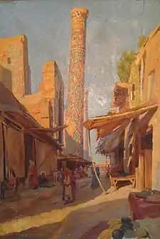 In 1906, he requested and obtained a position as a teacher of drawing and calligraphy at the Realschule in Tashkent, which he held until 1910.[1] While there he painted architectural landscapes in Samarkand and Bukhara as well as Tashkent. He also created a series of ethnographic sketches.