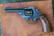 This model was made from 1890 to 1894 by Iver Johnson and distributed by John P. Lovell Arms Company of Boston, Massachusetts. It was a double action 5-shot revolver in caliber .38 S&W. It had a nickel finish and was the first Iver Johnson to use the owl's head logo on the grips. In appearance, the Swift model resembles the Safety Automatic Revolver that was introduced in 1894. Some differences include the latch for unlocking the frame pulls down rather than up, the ejector is different, and the Swift model does not have the "hammer the hammer action" of later models. The gun fired a .38 S&W black powder cartridge, and is not safe to shoot with modern smokeless powder cartridges. The hammerless model differed from the hammer model in that it did not have an external hammer protruding from the gun, and it had the addition of a manual safety on the trigger. This feature required the user to place a finger squarely on the trigger to fire the gun.[17] It has the word "Swift" engraved on the top of the gun, and the serial number is stamped under the left grip panel.