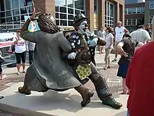 On August 17, 2008, a bronze statue of J. P. and Gertrude was unveiled on North 34th Street, about 250 feet east of the intersection with Fremont Avenue North, in the Fremont section of Seattle.[22] The unveiling date was to celebrate the 50th anniversary of the J. P. Patches show.[23] The statue is called Late for the Interurban by sculptor Kevin Pettelle[24] and is approximately 250 feet (76 m) east of Waiting for the Interurban. The unveiling was attended by hundreds of Patches' Pals, including Washington Governor Christine Gregoire, Congressman Jim McDermott, King County Executive Ron Sims, and several members of the county and city councils; both Chris Wedes (J. P. Patches) and Bob Newman (Gertrude) were present. The event was emceed by Pat Cashman, and the keynote address was given by Wedes' 16-year-old granddaughter, Christina Frost.[25]