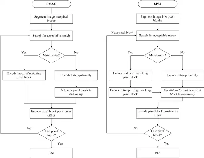 Pattern matching and substitution (PM&S) is the more classic coding method. The encoder performs image segmentation to isolate character-sized chunks. For each individual chunk, the encoder looks for a match in the bitmap dictionary. If a match exists, we code an index of the corresponding representative bitmap in the dictionary and the position of the character on the page. The position is usually relative to another previously coded character. If a match is not found, the segmented pixel block is coded directly and added into the dictionary. Typical procedures of pattern matching and substitution algorithm are displayed in the left block diagram of the figure above. Although the method of PM&S can achieve outstanding compression, substitution errors could be made during the process if the image resolution is low.[10]