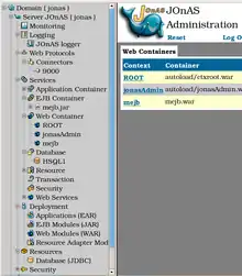 JOnAS has a comparatively clear remote management console, providing easily accessible tools for remote uploading and deploying of the web applications, configuring both secure and ordinary web access ports and managing the user name - password - role datasets. This console is based on the JavaScript. From the first impression, the consoles of the comparable open source Java EE servers seem more confusing, with many needed features not immediately visible. This is, however, more important in the teaching process, as Java EE servers are not meant to be managed by the unprepared end user.