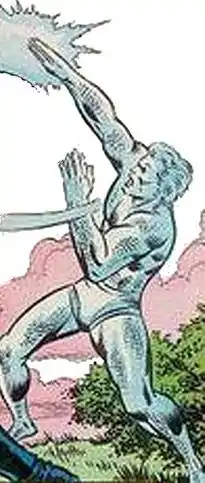 Jack Frost outwardly recalls the folklorish spirit of winter Jack Frost, with icy blue skin and blue shorts.[1] His powers and appearance resemble Iceman, another Stan Lee creation who appeared twenty years later, in 1963's The X-Men.[6]