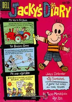 It purported to be the hand-illustrated, hand-written diary of a young boy, supposedly Mendelsohn himself in his extreme youth. Thus, it was both written and illustrated as though by a small child—which is not as easy to do as some who have had the misfortune of growing up might think. Week after week, Mendelsohn described trips to the circus, fishing expeditions, visits to members of his extended family, and all sorts of other adventures kids have, in a style simulating that of an actual kid—except, of course, for the fact that it was professionally rendered in every way. Unfortunately, professional work is sometimes best recognized by another professional, or at least by someone who knows what to look for—or at the very least, by someone who could see that this was a spoof, and that childishness was a schtick and not a natural state for Mendelsohn. King Features received complaints from those who didn't "get" it and thought the company was publishing the work of an actual child—or, in the case of those who noticed the byline ("by Jacky Mendelsohn, age 32+1⁄2") by an adult whose abilities hadn't progressed since childhood. Often, parents, mistaking the strip's intent, would encourage their own children to send in submissions to what they thought was a kids' participation feature. But that's not why it folded quickly, Mendelsohn said in a later interview. It's simply that a Sunday-only comic is more expensive to produce than a daily, and King just couldn't afford it anymore.[3]
