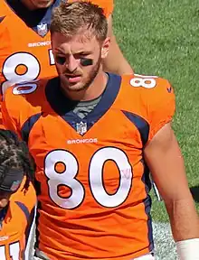 He made his professional regular season debut and first career start in the Denver Broncos' season opener against the Seattle Seahawks and caught two passes for 29 yards in their 27–24 victory.[39] On September 27, 2018, Butt sustained a torn ACL during a non-contact drill during practice, which sidelined him for the remainder of the season.[40][41]