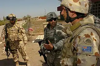 ![]() Lieutenant Colonel Ellwood (right) talking to a United States Army officer in Nasiriyah, Iraq, in September 2007 | |