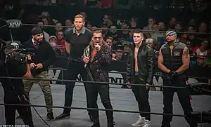 On October 2, 2019, Hager debuted in All Elite Wrestling (AEW) on the inaugural episode of Dynamite, aligning himself with Chris Jericho, Santana and Ortiz, and Sammy Guevara by helping them take out The Young Bucks, Cody, and Dustin Rhodes in the aftermath of the main event.[152] Led by Jericho, he subsequently formed a new faction with Guevara, Santana, and Ortiz called The Inner Circle. His in-ring debut match for AEW occurred on February 29, 2020, at Revolution, where he defeated Dustin Rhodes.[153][154] On March 25, 2020, episode of Dynamite, Jon Moxley attacked Hager after a match with Chico Adams.[155] Following this, on the March 31, 2020 episode of AEW Dark, Hager attacked Moxley as revenge.[156] The rivalry resulted in an Empty Arena No Holds Barred match for the AEW World Championship at April 15, 2020 episode of Dynamite, which Hager lost to Moxley, marking his first loss in AEW.[157] On the February 9, 2022 episode of AEW Dynamite, the Inner Circle had a team meeting that ended with Sammy Guevara throwing his vest and walking out. It was later announced that Jericho and Hager would face Santana and Ortiz in a tag team match the following week, with it being billed as the Inner Circle Implodes match.[158] On the March 9, 2022 episode of Dynamite, the Inner Circle was disbanded after Hager assisted Jericho in attacking Santana and Ortiz and joined a new stable with Jericho, Daniel Garcia and 2.0 called the Jericho Appreciation Society.
