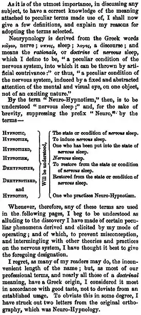 - I therefore think it desirable to assume another name [than animal magnetism] for the phenomena, and have adopted neurohypnology – a word which will at once convey to every one at all acquainted with Greek, that it is the rationale or doctrine of nervous sleep; sleep being the most constant attendant and natural analogy to the primary phenomena of mesmerism; the prefix "nervous" distinguishing it from natural sleep. There are only two other words I propose by way of innovation, and those are hypnotism for magnetism and mesmerism, and hypnotised for magnetised and mesmerised.