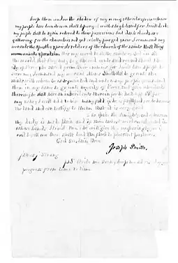 Strang rested his claim to leadership on an ordination by an angel at the very moment Joseph Smith died (similar to the ordination of Smith), requirements that he claimed were set forth in the Doctrine and Covenants that the President had to be appointed by revelation and ordained by angels, and a "Letter of Appointment" from Smith, carrying a legitimate Nauvoo postmark. This letter was dated June 18, 1844, just nine days before Smith's murder.[17] Smith and Strang were some 225 miles (362 km) apart at the time,[17] Strang offered witnesses to affirm that he had made his announcement before news of Smith's demise was publicly available.[20] Strang's letter is held today by Yale University. Every aspect of the letter has been disputed by opposing factions, including the postmark and the signature [21][22] however the postmark is genuine and at least one firm (Tyrell and Doud) hired to analyse the document and compare it to Smith's known letters concluded that it was likely to have been authored by Smith. They concluded "A brief observation of these four documents indicates that the education and word usage was consistent with the theory that all four documents were authored by one individual."[23]