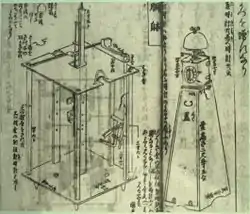 A key component of the development of Japanese clocks was the publication of Hosokawa Hanzo's Karakuri Zui in 1796, in which he explains production methods of clocks in the first volume, and karakuri ningyō (絡繰人形) or "mechanical dolls" in the second and third volumes.[7] The volume on clockmaking contained highly detailed instructions for the production of a weight-driven, striking clock with a verge escapement controlled by a foliot.[8] Relatively high literacy rates and an enthusiastic, book-lending society contributed greatly to the work's widespread readership.[9]