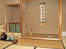 Kakemono hanging in the tokonoma of a tearoom in Uji, with tea utensils to the left.