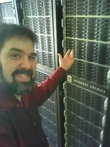 Scott in front of a PetaBox. Scott was hired by the Internet Archive in 2011.