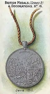 The Java Medal is a campaign medal awarded by the Governor-General of India to soldiers of the armies of the Honourable East India Company (HEIC) who participated in the Invasion of Java in August and September 1811, during the Napoleonic Wars.[1]