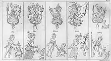 The origin of the names is unclear, and their etymology remains obscure. Possibly, the names may be derived from indigenous gods, like the European and Asian names for days of the week.[5] An ancient Javanese manuscript illustrates the week with five human figures (shown at right below the day names): a man seizing a suppliant by the hair, a woman holding a horn to receive an offering, a man pointing a drawn sword at another, a woman holding agricultural produce, and a man holding a spear leading a bull.[5]