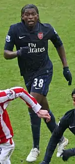 Emmanuel-Thomas was an unused substitute for the Premier League games against Burnley on 16 December and Hull City three days later as well as Everton on 9 January 2010. On 18 December he signed a new long-term contract.[12] He scored a hat-trick for the reserves in their 4–2 Premier Reserve League South win over West Ham United at Upton Park on 12 January 2010.[13] He made his Arsenal debut when he started the 4th round FA Cup tie against Stoke on 24 January 2010. Playing as a striker in a 3-man attack, he was substituted after 66 minutes.