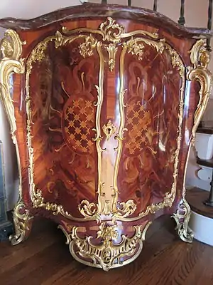 In May 1736 Latz was naturalized as a French citizen.[13] In 1741 he was appointed ébéniste privilegié du Roi,[14] a court appointment under royal warrant that should have freed him from certain Parisian guild restrictions. Robust and sculptural gilt-bronze mounts that show technical virtuosity in casting and the chasing of their surfaces are a consistent feature of Latz' identified work, and in this vein Henry Hawley has noted that he was investigated in December 1749 by the Paris guild of workers in metal (Communauté des fondeurs), for casting and chasing mounts in his own workshop, a privilege that was normally reserved to the metalworkers' guild.[15] In spite of his warrant as ébéniste privilegié, all his bronze-chasing tools were confiscated and, what must have been an overwhelming loss, a thousand models for bronze mounts.[16] Some of his furniture mounts can be dated 1745-49 by the tiny "crowned c" tax stamp they bear, that was in effect only during those years; an example is Latz' commode in the Cincinnati Art Museum.[17]