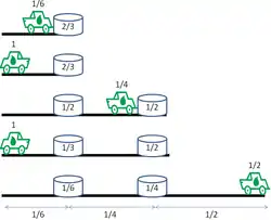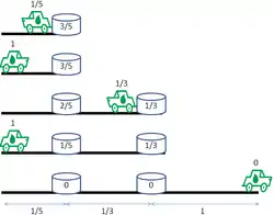 units on its final trip (the maximum distance traveled into the desert is half of this).[3] It collects half of the remaining fuel at each dump on the way out, which fills its tank. After leaving the farthest fuel dump it travels 1/2 a unit further into the desert and then returns to the farthest fuel dump. It collects the remaining fuel from each fuel dump on the way back, which is just enough to reach the next fuel dump or, in the final step, to return to base.