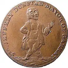 Dunstan appeared on some trade tokens issued by Thomas Hall, Taxidermist of City Road Finsbury. The tokens were issued in 1795 in connection with Halls trade as a taxidermist and his exhibition of stuffed animals at his home in City Road dubbed the Finsbury Museum.