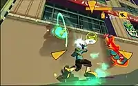 Much of the game requires the player to search for graffiti tags left by other gangs and spray over them with their own. To do this, players will need to collect spray cans littered across each stage. Spraying is more streamlined from the last game, with manual spraying over large tags replaced by multiple spray targets depending on the tag's size.[2][3][7] Unlike Jet Set Radio, there is no time limit and spray targets can be completed at any time.[7]