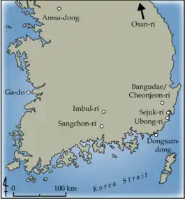 The Early Jeulmun period (c. 6000-3500 BC) is characterized by deep-sea fishing, hunting, and small semi-permanent settlements with pit-houses. Examples of Early Jeulmun settlements include Seopohang, Amsa-dong, and Osan-ri.[10] Radiocarbon evidence from coastal shellmidden sites such as Ulsan Sejuk-ri, Dongsam-dong, and Ga-do Island indicates that shellfish were exploited, but many archaeologists maintain that shellmiddens (or shellmound sites) did not appear until the latter Early Jeulmun.[5]