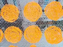 Jhilinga is a traditional Nepalese food specially popular during festivals.[1] Jhilinga is super crunchy, and is favored by people of all age groups.[2] It is closely associated with people of different ethnicity like the Gurungs, Newars, Magars, Brahmins.[3] Popularity of Jhilinga still largely exists in villages and towns of Nepal. The process of making Jhilinga is really simple requiring minimal ingredients. However, a good set of skilled hands is required to craft the pieces into proper circles.