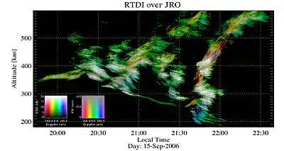 Example of ESF range-time intensity radar map observed over the Jicamarca Radio Observatory. The Doppler information has been color-coded, where hue represents the mean Doppler, saturation the spectral width, and lightness the signal-to-noise ratio of the echoes. - Daytime Valley echoes (or so-called 150 km echoes). What are the physical mechanisms causing them? (still a puzzle after more than 40 years!).