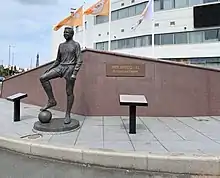 The South Stand at Bloomfield Road, which was opened on 20 March 2010, is named the "Jimmy Armfield South Stand" with ARMFIELD spelled out in white seats amongst the tangerine majority. A statue of Armfield was commissioned by the Blackpool Supporters' Association in 2009. The nine foot high statue, costing £100,000, is located outside the main entrance, behind the West Stand facing Seasiders Way, and was unveiled by Sir Trevor Brooking on 1 May 2011.[34][35][36]