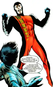 Jack Kirby's Fourth World storyline began in Jimmy Olsen comics in 1970, with issue No. 134.[16] Kirby began by introducing a secret "D.N.A. Project" to create Mutated Humans for Good, adding "the Hairies" (a group of technology-equipped hippies), superbeings from other planets (proto-New Gods), Intergang, Darkseid, and the WGBS media executive Morgan Edge. Kirby also used the series as a vehicle to reintroduce Golden Age characters that he previously created at DC Comics, such as Guardian and the Newsboy Legion.[17] Before the end of his run, Kirby wrote stories involving vampires,[18][19] the Loch Ness Monster,[20] Victor Volcanum, a fire-eating archcriminal,[21] as well as a two-part story featured the comedian Don Rickles. Kirby left the series following issue #148.