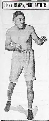 Jimmy Reagan (1888-1975) was an American boxer who claimed the World Bantamweight Championship in a twelve-round bout on January 29, 1909 against Jimmy Walsh at Dreamland Rink in San Francisco, California.[1] He lost the title only a month later in an historic twenty round bout on February 22, 1909 to Monte Attell at the Mission Street Arena in San Francisco.[2] Reagan's primary manager was Jack Davis. During his career he fought Battling Nelson, Peanuts Sinclair, future lightweight champion Willie Ritchie, World Feather and Lightweight contender "Mexican Joe" Rivers and reigning lightweight champion Benny Leonard.[3]