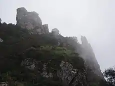 Despite his influence on the course of Northern Chinese painting, few works produced by Jing Hao have survived to the present day, and those that have are in poor condition. The piece most frequently held as a template of his style is Mount Lu, an ink painting on silk scroll which gives a rather fantastical rendering of one of Jiangxi's natural landmarks.[2] The work is a tight, vertical composition, employing Jing's newly developed cun fa technique to compress the landscape into layers of jutting rock-pillars between chasms of mist. The enclosed space of the composition enhances the monumental characteristics of the mountain, which fills some 90% of the scroll. Humans and buildings, though drawn with remarkable realism in a manner that contrasts sharply against the atmospheric landscape surrounding, are reduced to an almost unnoticeable scale, clustered at the foot of the mountain at the very bottom of the scroll, further conveying the intimidating grandeur of the natural world over the transient activities of man. Scholars have noted, however, that the mist in Mount Lu plays only a minimal role compared with that seen in some of Jing's other works, being employed much more conservatively than is common for the artist—a fact which has led to some speculation among art historians that this particular work may represent a “reminiscence” during a later period in the artist's life.