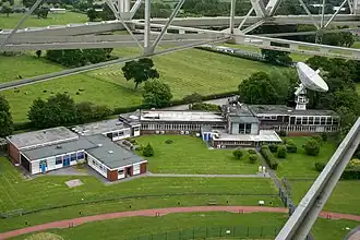 The "Mark I" telescope, now known as the Lovell Telescope, was the world's largest steerable dish radio telescope, 76.2 metres (250 ft) in diameter, when it was constructed in 1957;[17] it is now the third largest, after the Green Bank telescope in West Virginia and the Effelsberg telescope in Germany.[18] Part of the gun turret mechanisms from the First World War battleships HMS Revenge and HMS Royal Sovereign were reused in the telescope's motor system.[19] The telescope became operational in mid-1957, in time for the launch of the Soviet Union's Sputnik 1, the world's first artificial satellite. The telescope was the only one able to track Sputnik's booster rocket by radar;[20][21] first locating it just before midnight on 12 October 1957, eight days after its launch.[22][23]