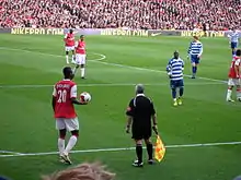 His first appearance of the 2005–06 season came on 29 November 2005 against Reading in the Round of 16 of the League Cup, starting the whole game, in a 3–0 win.[19] He then played in the third round clash with Cardiff City.[20] Djourou made his full Premiership debut for Arsenal in the 7–0 victory over Middlesbrough on 14 January 2006, playing at centre-back with Philippe Senderos.[21] He started Arsenal's FA Cup fourth round clash with Bolton Wanderers as part of a makeshift defence, a game in which Arsenal lost 1–0.[22] In February 2006, Djourou played in the league games against West Ham United, Birmingham City and Bolton Wanderers.[23] After a five match absent, he returned to the first team, coming on as a substitute against Aston Villa in Arsenal's 5–0 victory, replacing the injured Emmanuel Eboué.[24] Djourou then started in a league match against Portsmouth on 12 April 2006, a game which also saw the comeback of Sol Campbell, in a 1–1 draw.[25] At the end of the 2005–06 season, he went on to make twelve appearances in all competitions.
