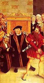 On 17 March 1533,[11] he was promoted doctor of theology at the university of Wittenberg, together with Johannes Aepinus and Kaspar Cruciger.[11][12] The promotion was supervised by Martin Luther, based on Philipp Melanchthon's theses, financed and attended by Frederick III, Elector of Saxony, and formally granted by deacon Justus Jonas. With the ceremony in Wittenberg's castle church (Schloßkirche),[11] Aepinus, Bugenhagen and Cruciger became the first three Protestant doctors of theology.[12]