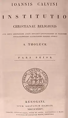 At the age of twenty-six, Calvin published the first edition of his Institutes of the Christian Religion (Latin title: Institutio Christianae Religionis), a seminal work in Christian theology that is still read by theological students today.[2] It was published in Latin in 1536 and in his native French in 1541, with the definitive editions appearing in 1559 (Latin) and in 1560 (French). The book was written as an introductory textbook on the Protestant faith for those with some learning already and covered a broad range of theological topics from the doctrines of church and sacraments to justification by faith alone and Christian liberty, and it vigorously attacked the teachings of those Calvin considered unorthodox, particularly Roman Catholicism to which Calvin says he had been "strongly devoted" before his conversion to Protestantism. The overarching theme of the book – and Calvin's greatest theological legacy – is the idea of God's total sovereignty, particularly in salvation and election.[2]