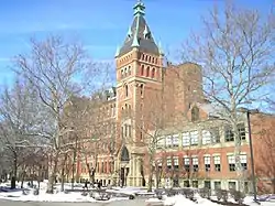 More than twenty major buildings, predominantly Collegiate Gothic in architecture (not to be confused with the common Tudor Revival style found in much of Cleveland Heights), and sixty landscaped acres make up the John Carroll campus. The Administration Building, surmounted by the university's landmark Grasselli Tower, bears clear resemblance to the English royal palace Hampton Court.