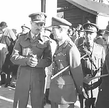 He returned to Kenya in December 1945 and remained there until January 1948.[40] He remained for two years as GOC-in-C of Southern Command,[41] until in 1947 he moved on to be Commander-in-Chief (C-in-C) Middle East Land Forces in succession to Lieutenant-General Sir Miles Dempsey during the final stages of the Palestine Emergency.[41] He was advanced to Knight Commander of the Order of the Bath (KCB) in the 1947 Birthday Honours.[42] In 1950 Crocker's career culminated in his appointment as Adjutant-General to the Forces.[43]
