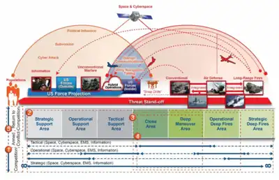- Multi-Domain Operations (MDO):[lower-alpha 4][lower-alpha 3][35][36][37][38] Joint planning and operations are also part of the impending DoD emphasis on multi-domain operations.[39][40][41][42][43] Multi-domain battalions,[lower-alpha 5] first stood up in 2019,[44][45] comprise a single unit[46][47] for air, land,[48] space,[49][50][51][52]—and cyber[53][54] domains.[55][56][54] A hypersonic-based battery similar to a THAAD battery is under consideration for this type of battalion,[57][58] possibly denoted a strategic fires battalion[59][60][61] (however I2CEWS support would likely be needed),[lower-alpha 5] depending on the theater. In 2019, as part of a series of globally integrated exercises, these capabilities were analyzed.[62][63][64] Using massive simulation[37][65] the need for a §new kind of command and control (now denoted JADC2) to integrate this firepower was explored.[48][66]