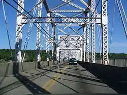 Construction of a 1,600-foot (490 m)-long steel multi-girder replacement bridge just upstream of the original bridge began in September 2013.[5][6][7][8][9] The new bridge, which opened to traffic on October 20, 2015,[10][11][12][13] has four 11-foot (3.4 m)-wide traffic lanes (2 in each direction), one 4-foot (1.2 m)-wide median, one 4-foot (1.2 m)-wide shoulder on each side of the roadway, and a 5-foot (1.5 m)-wide ADA-compliant sidewalk on the bridge's southern side.[13][14]