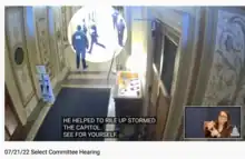 On July 21, 2022, the House Select Committee broadcast video footage of Hawley running through the halls of Congress to escape the mob on January 6, contrasting it with his earlier fist-raised encouragement of the crowd.[127][160] The video provoked laughter in the chamber and commentary on social media that included "Run Josh Run" (Dan Rather) and "Josh Hawley running away to a variety of soundtracks."[127][161]