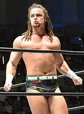 On January 5, 2017, Robinson scored a major win over NEVER Openweight Champion Hirooki Goto in a ten-man tag team match and afterwards indicated he wanted a shot at his title.[29] Robinson received his title shot on February 5 at The New Beginning in Sapporo, but was defeated by Goto.[30] On April 9 at Sakura Genesis 2017, Robinson picked up the biggest win of his career, pinning former IWGP Heavyweight Champion Tetsuya Naito in an eight-man tag team match and afterwards challenging him to a match for the IWGP Intercontinental Championship.[31] Robinson received his title shot on April 29 at Wrestling Toyonokuni 2017, but was defeated by Naito.[32] In early 2017, Robinson became part of the Taguchi Japan stable,[33] as part of which he unsuccessfully challenged for the NEVER Openweight 6-Man Tag Team Championship, first on June 11 at Dominion 6.11 in Osaka-jo Hall and again on June 20 at Kizuna Road 2017.[34][35] On July 1 at G1 Special in USA, Robinson took part in a tournament to determine the inaugural IWGP United States Heavyweight Champion, but was eliminated in his first round match by Zack Sabre Jr.[36] Later that month, Robinson entered his first G1 Climax tournament.[37] On August 5, Robinson picked up a major win over the winner of the 2016 G1 Climax and reigning IWGP United States Heavyweight Champion Kenny Omega.[38] Robinson went on to finish in the bottom half of his block with a record of four wins and five losses.[39] On September 24 at Destruction in Kobe, Robinson unsuccessfully challenged Omega for the United States Heavyweight Championship.[40] At the end of the year, Robinson formed a tag team named "Death Juice" with the debuting Sami Callihan in the 2017 World Tag League.[41] The team finished second in their block with a record of four wins and three losses, failing to advance to the finals.[42]