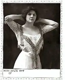 Julie (sometimes spelled Julia) Opp was born in New York City on January 28, 1871,[1] the daughter of John "Johnny" and Mary Opp. Johnny Opp, the son of Bavarian immigrants, ran a saloon on Lower Manhattan's Bowery and was also active in local neighborhood politics. Mary Dwyer, a first generation Irish-American, was some thirteen years her husband's junior and in her late teens when Julie was born. As a child Opp attended public school for a time before her mother decided it best she was educated at a local convent. There she astounded the sisters and amused a bishop by declaring her ambition to become a ballet dancer when he asked what she wanted to be when she grew up. By the time of her graduation, journalism had replaced ballet, and with the help of a friend she became a fashion writer for the New York Recorder.[2][3]