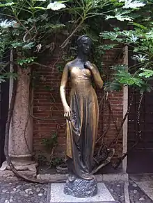 In Verona, an early 14th-century house at Via Cappello no. 23, claiming to be the Capulets' has been turned into a tourist attraction but it is mostly empty. The real second name was in Italian Cappelletti, a noble family, and not Capuleti. Cappelletti were in the past members of the light cavalry of the Republic of Venice. They fought for it since the 13th century and they were originally from Dalmatia and Albania. It features the balcony, and in the small courtyard, a bronze statue of Juliet. It is one of the most visited sites in the city. The metal of its chest is worn bare due to a legend that if a person strokes the right breast of the statue, that person will have good fortune and luck in love.[7]