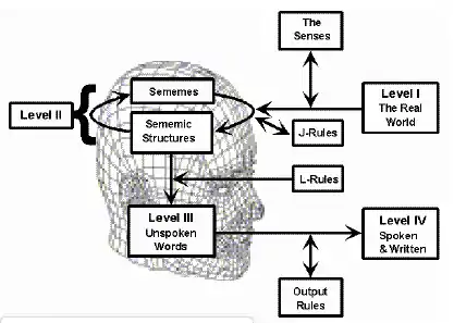 - Implementing Saussure's concept of signified-signifier linkages[5] by constructing coding grammars to transpose the structuring of one tract to the data type of another, as for example the transposition of J-rule structuring into the lexical strings required for writing or articulation. The essence of the departure from Chomsky's model in this case was that coding between biologically grounded tracts supplanted interpretation of deep structure in the abstract.