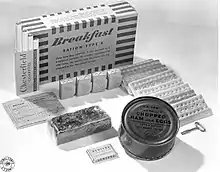 The K-ration was a United States military ration consisting of three separately boxed meal units: breakfast, dinner, and supper.[1] It was originally intended as an individually packaged daily ration for issue to airborne troops, tank crews, motorcycle couriers, and other mobile forces for short durations.[2]