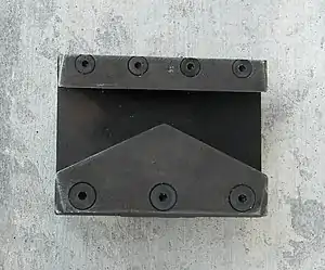 The K-tool, also known as a "K-spreader" or a "K-tool spreader," is a specialized forcible entry tool used by firefighters to gain access to buildings or other structures in emergency situations. It is named for its distinctive "K" shape, which allows it to be used for a variety of purposes.[1] It is used in conjunction with a Halligan bar and a flat-headed axe or maul (commonly referred to as "irons" or (with a maul instead of an axe) "heavy irons" [2]) to remove a cylinder lock. It consists of a steel block roughly 3 inches by 3 inches by 1 inch thick with a K-shaped notch on one side, having sharp edges that grip the cylinder, and a U-shaped flange on the other side. The notch is slipped over the lock cylinder, then forced down by striking with the flat side of the axe or maul. The halligan is then inserted into the flange and used to pry the K-tool off the door, thereby pulling the entire key cylinder out. The bolt is then retracted from the inside of the cylinder hole using a turning tool, such as a screwdriver.