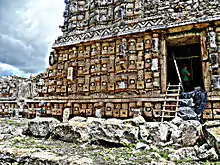 The most famous structure at Kabah is the "Palace of the Masks", the façade decorated with hundreds of stone masks of the long-nosed rain god Chaac; it is also known as the Codz Poop, meaning "Rolled Matting", from the pattern of the stone mosaics.[1] This massive repetition of a single set of elements is unusual in Maya art, and here is used to unique effect.[1]