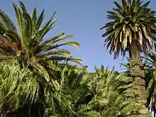 The original twenty-four Canary Island Date Palms (Phoenix canariensis) were planted by the English diplomat Atkinson who brought them from Egypt in the late 19th century. Later when those palms were starting to produce seeds, new palms born around, so that today we can speak for a small but dense palm forest, which at 80% of its palm population is natural and totally (artificial and natural way vegetation) has about 150-155 phoenix canariensis palm trees. The forest continues to propagate new seed palms yet, but it has not been protected by the local authority. These seed palms are food for some local vegetarian animals or being stolen, so the forest spreads out very slowly.