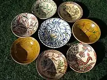 Kalu-Khani Thalee were traditional glazed earthenware deep dishes or plates used on special occasions to serve guests or members of Hashar (collective voluntary working force). It was used up until around last quarter of 20th century in most of the villages of Swabi District, Mardan Division, Khyber Pakhtunkhwa, Pakistan.[1] Every household used to keep a few of these decorative glazed dishes for serving the guests on special occasions and celebrations. They were decorated and glazed in different colours. Conventionally, hot chicken curry was served in these dishes, with almost enough for 4 to 6 persons for combined or group eating added with another special paste- curry called Lawanr. Lawanr, being a viscous mixture, was especially cooked for the purpose of thickening the otherwise thin chicken curry from Shumle and maize flour.