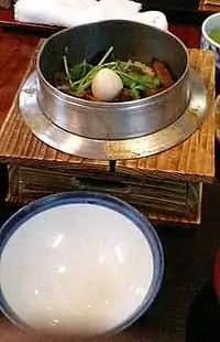 Kamameshi (釜飯) literally translates to "kettle rice" and is a traditional Japanese rice dish cooked in an iron pot called a kama. Kamameshi originally referred to rice that was eaten communally from the kama. Coworkers or family members either ate directly from the kama pot or by transferring the rice to individual bowls.[1] The term emerged in the late Meiji period, and is associated with the communal eating of rice in the aftermath of the 1923 Great Kantō earthquake. Later, similar to takikomi gohan, kamameshi came to refer to a type of Japanese pilaf cooked with various types of meat, seafood, and vegetables, and flavored with soy sauce, sake, or mirin.[2][3] By cooking the rice and various ingredients in an iron pot, the rice gets slightly burned at the bottom which adds a desirable flavor to the rice. Kama designed specifically to prepare kamameshi appeared on the market as the dish became popular across Japan, and the prepared kamameshi is placed directly on the table in its pot for the meal.[1] A small-scale replica of the kama is used to create an individual serving of kamameshi, and the dish is now a popular ekiben.