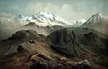 The brothers Hermann, Adolf and Robert Schlagintweit explained the local name 'Kanchinjínga' meaning “The five treasures of the high snow” as originating from the Tibetan word "gangs" pronounced [kaŋ] meaning snow, ice; "chen" pronounced [tɕen] meaning great; "mzod" meaning treasure; "lnga" meaning five.[11] Local Lhopo people believe that the treasures are hidden but reveal themselves to the devout when the world is in peril; the treasures comprise salt, gold, turquoise and precious stones, sacred scriptures, invincible armor or ammunition, grain and medicine.[12]