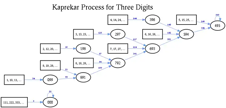 If the Kaprekar routine is applied to numbers of three digits in base 10, the resulting sequence will almost always converge to the value 495 in at most six iterations, except for a small set of initial numbers which converge instead to 0.[7]